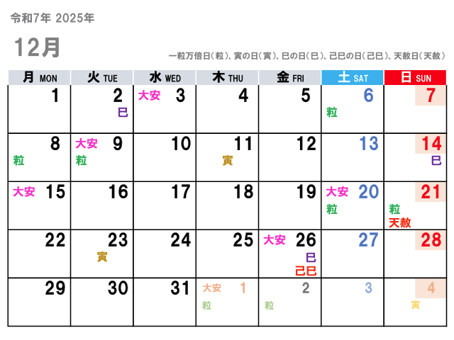 大安・一粒万倍日・寅の日・巳の日・己巳の日・天赦日